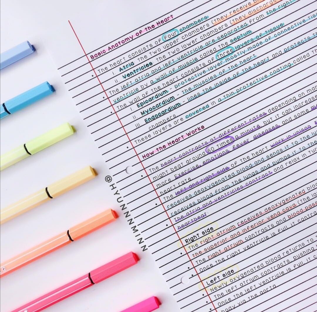 - Visualize concepts : Draw charts or figures in the margins of your notes or use highlighters or pens in different colors to group related ideas in your written study materials.