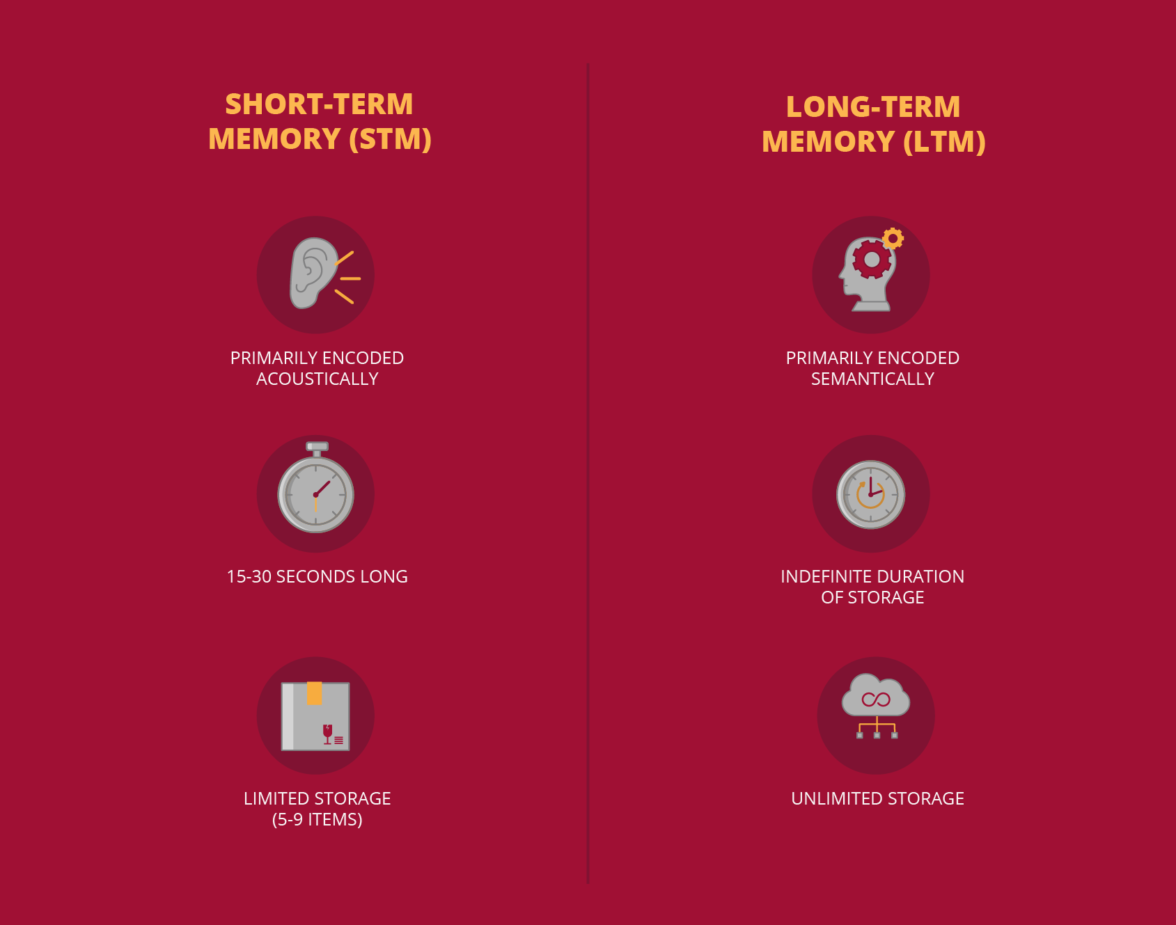- Storage: Refers to how, where, how much, and how long encoded information is retained within the memory system. It highlights the existence of two types of memory : short-term and long-term memory.